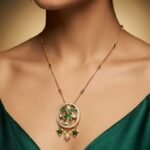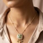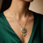• Floral-inspired round pendant with emerald green kundan highlights