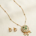 This Emerald Floral Kundan Pendant Necklace Set is a graceful blend of traditional artistry and modern elegance. The delicate gold-toned chain is adorned with minimal bead detailing and finished with a beautifully crafted round floral pendant featuring rich green kundan stones and luminous white accents. The pearl and green bead drops add movement and charm, while the matching kundan stud earrings complete the look with refined sparkle.