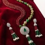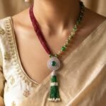 An exquisite expression of elegance and grandeur, the Emerald Royale Beaded Necklace Set blends rich color with refined craftsmanship. Featuring flowing strands of deep ruby-toned micro beads paired with polished emerald-green accent beads, this luxurious design is crowned by a radiant circular centerpiece with a bold emerald-cut stone, encircled in shimmering crystal brilliance. Cascading green bead tassels finished with soft pearl drops complete the look, while the matching tassel earrings echo the necklace’s majestic silhouette.