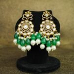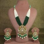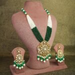 An exquisite harmony of colour and craftsmanship, this emerald and pearl necklace set is designed for those who seek timeless luxury with a contemporary soul. The long haram features finely hand-strung strands of deep green beads transitioning into luminous ivory pearls, creating a refined contrast that rests gracefully along the neckline.