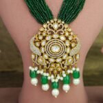 The statement pendant is a masterpiece of artisanal detailing, adorned with concentric layers of uncut polki-style stones set in radiant gold tones. Delicate pearl and emerald drops cascade from the pendant, lending fluid movement and ceremonial elegance. Complemented by matching earrings that mirror the pendant’s intricate design, this set radiates understated grandeur and heirloom appeal.