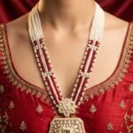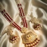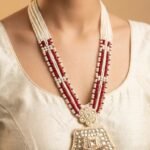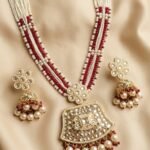 A timeless symbol of grace and grandeur, the Raani Pearl Kundan Long Necklace Set is designed for brides who desire royal elegance. Featuring multiple strands of luminous ivory pearls interwoven with rich ruby-red accents, this majestic necklace flows into a lavishly crafted kundan pendant finished with delicate pearl and ruby bead drops. The matching jhumka earrings mirror the pendant’s intricate beauty, creating an ensemble that exudes regal sophistication from every angle.