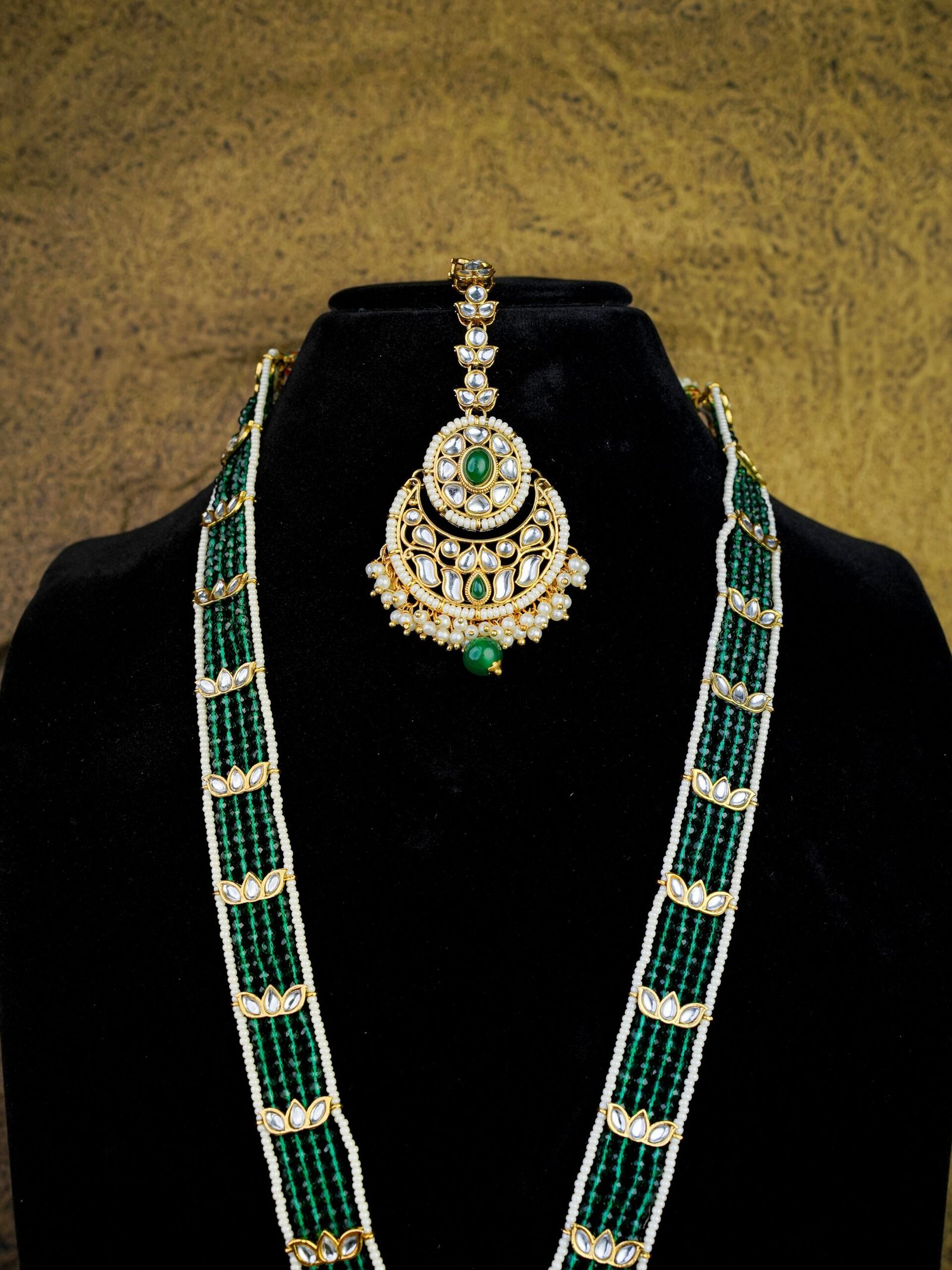 An exquisite celebration of refined opulence, this emerald-toned necklace set is a masterful blend of classic Indian elegance and contemporary sophistication. The long haram is meticulously handcrafted with multiple strands of deep green beads, delicately interspersed with uncut stone accents framed in luminous gold tones, creating a graceful rhythm of colour and brilliance.