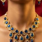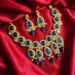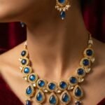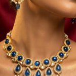 Bold, radiant, and exquisitely regal — the Sapphire Noor Kundan Necklace Set is crafted to captivate. Featuring luminous sapphire-blue cabochon stones framed by shimmering kundan detailing, this statement necklace flows into graceful teardrop motifs finished with delicate pearl clusters and rich blue bead drops. The matching drop earrings complete the ensemble, creating a powerful yet elegant silhouette that commands attention at every celebration.
